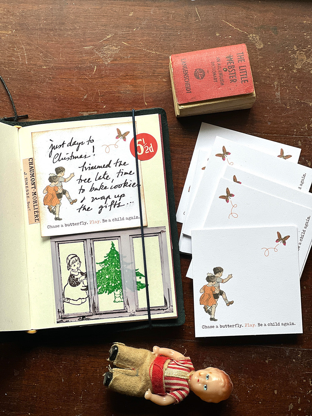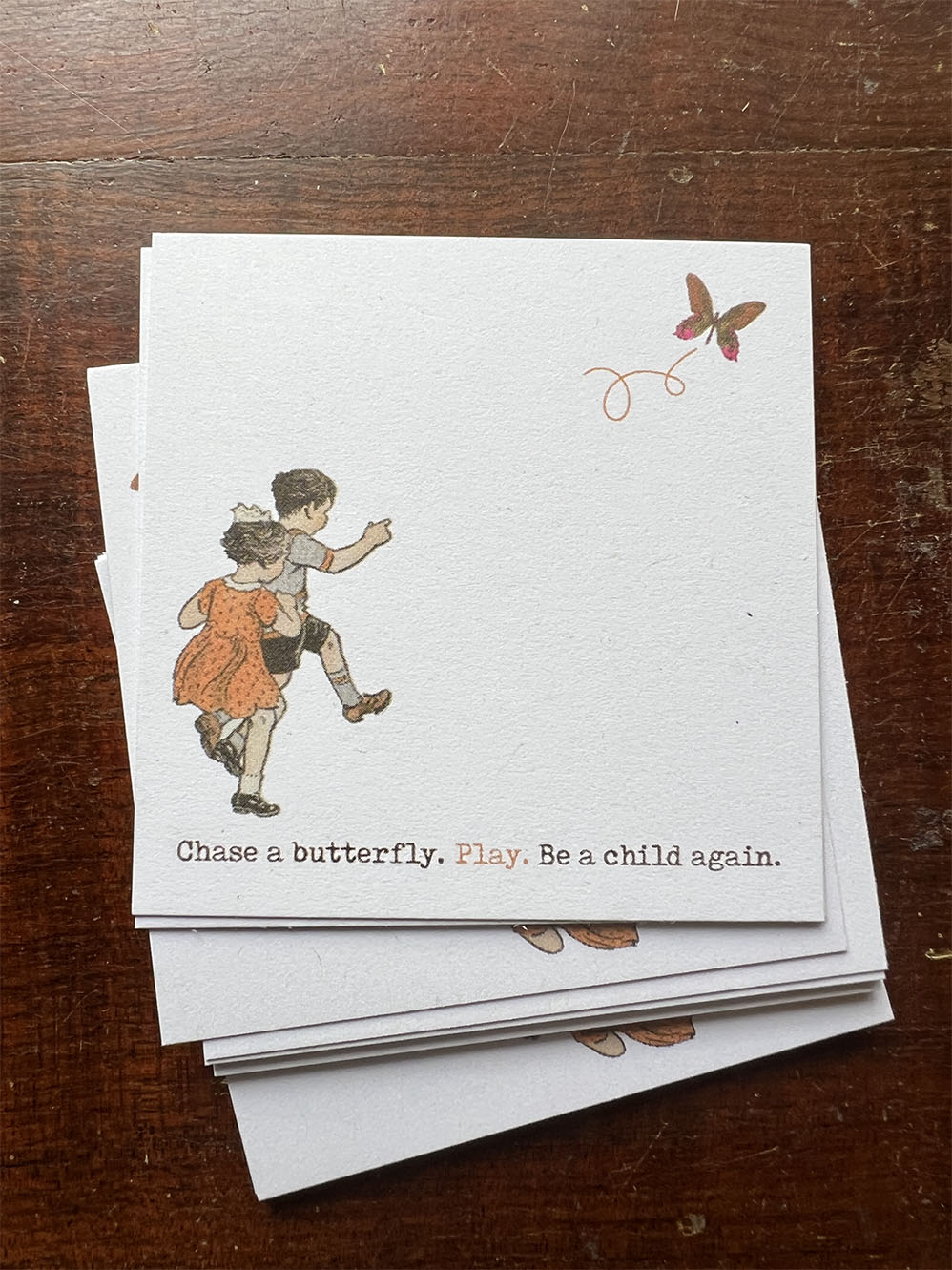 'Chase A Butterfly' Journal Card Set (Happy Days series) - Capture your thoughts and memories in our new Happy Day series journal cards.  Featuring altered Dutch vintage children’s illustrations reimagined with new story lines.  These elegant journal cards add a nostalgic touch to your journaling or paper craft projects. This blank portrait journal card set is printed on uncoated card stock with a premium quality weight and is made from recycled paper printed in Australia.  It can be used on typewriters, stamped on or written on with fountain pen inks and adds an elegant touch to your journal pages.